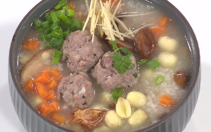 Khi cháo đã nở bung, lúc này cho vào nồi các nguyên liệu: Cà rốt, hạt sen, nấm đông cô khô sau đó khuấy đều. Cuối cùng cho phần bò viên đã chuẩn bị vào.